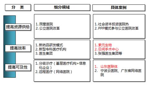 2.2 病中 对于消费者而言,病中的需求主要是方便快捷低成本地获得优质医疗服务。因此,我们认为,这一领域可以细分为三大类:提高医疗资源供给、提高效率和提高医疗资源的可及性。