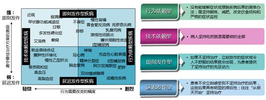 2.3.1慢病管理 各种慢性病之间存在根本差异,在建立有效商业模式之前,需先区分界定不同类别的慢性病。根据《创新者的处方》中分类,将慢性病通过两个维度划分为四类(慢性病矩阵):