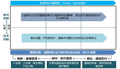 模式创新以盈利的方式把精简的解决方案提供给消费者,使这些方案既能被支付,又方便可用。在就医产业链中,病前、病中、病后均存在模式创新机会。