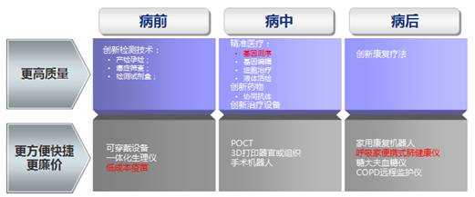 通过扫描矩阵,对“新医疗”机遇进行全景式扫描,我们可以快速发掘出各就医环节技术创新、模式创新类机会。