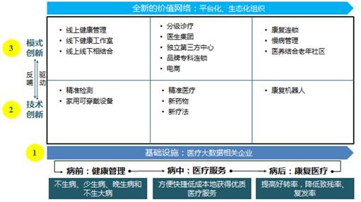 以就医产业链为横轴,技术创新和模式创新为纵轴,构建“新医疗”投资/创业机遇扫描矩阵。其中,横轴就医产业链,分为病前、病中和病后三个部分。纵轴在技术创新和模式创新类别之外,还有两类贯穿整个产业链:一是基础设施层,即医疗大数据相关企业;二是全新的价值网络,即平台化、生态化组织。