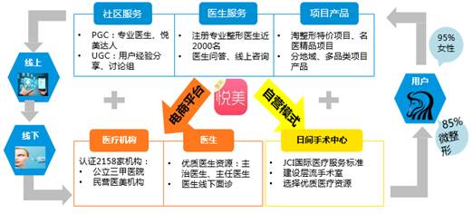 案例:悦美 悦美网成立于2012年, 2013 年 9 月开始,悦美网全面转型医美 O2O 模式,线上对接用户,线下整合医疗机构、医生等资源,并将整形项目标准化。目前悦美已完成B轮融资,并正在筹建线下日间医美手术室。