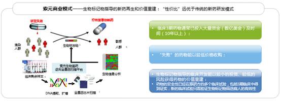 案例:索元生物 索元从国际大药厂引进经过临床II、III期试验证明其安全性并对部分病人有效的新药,利用其独创专有的生物标记物平台技术在残余的临床样本中找到可预测药物疗效的生物标记物。通过使用这些新发现的生物标记物作为伴随诊断来筛选病人,索元能够在敏感患者中重新开展临床试验,从而优化疗效、安全性和耐受性,提高新药的成功率,从而达到以较低的成本、较快的时间开发出一批创新药。