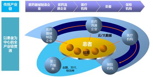 随着互联网、移动互联网、可穿戴设备、大数据、云计算等诸多技术的跨界融合,医疗产业链的联系日益强化,数据与服务的交互日益深入,传统的链式产业链将被打破,形成以患者为中心的“患者+医疗资源+云”的全产业链连通。