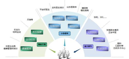 站在消费者就医便利性角度,我们认为,消费者心智中的就医保健理想途径是:保健预防选周边,在线问诊、家庭医生和诊所负责“小急慢长”,而“疑难危重”选品牌医院和专家。