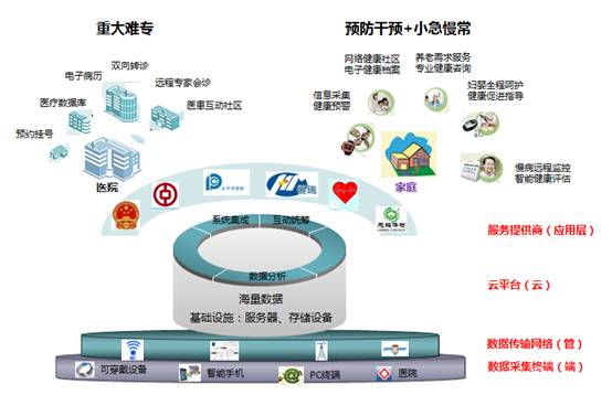 随着移动互联网、大数据、云计算,以及精准医疗等技术的不断发展,我们认为,未来的医疗健康服务将形成这样的一个图景:以医疗大数据、云计算为核心的“云-管-端+应用”的产业生态(如图1)。