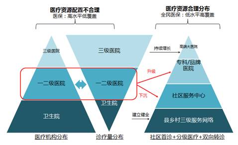 从供给端视角,我们认为“新医疗”的机会点: 1、基层医疗服务体系重建题材; 2、大型民营非营利医院。