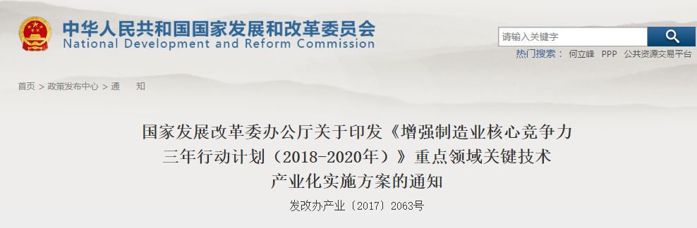 12月26日,国家发改委办公厅在官网发布了一则通知——关于印发《增强制造业核心竞争力三年行动计划(2018-2020年)》重点领域关键技术产业化实施方案的通知。