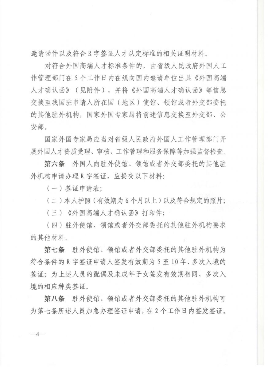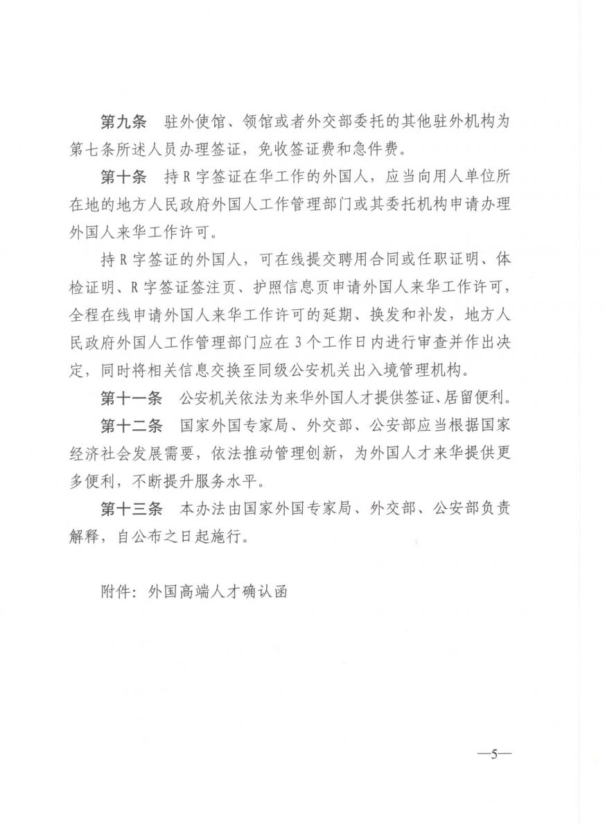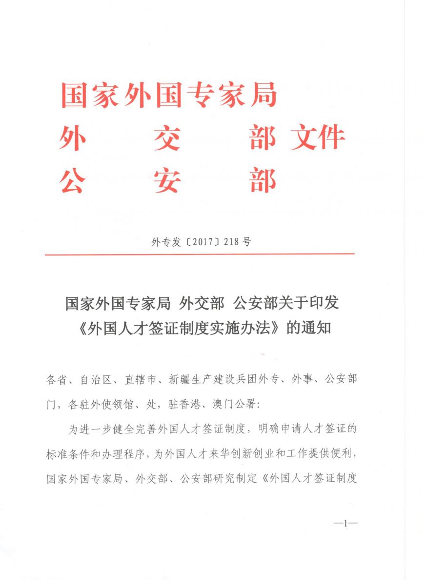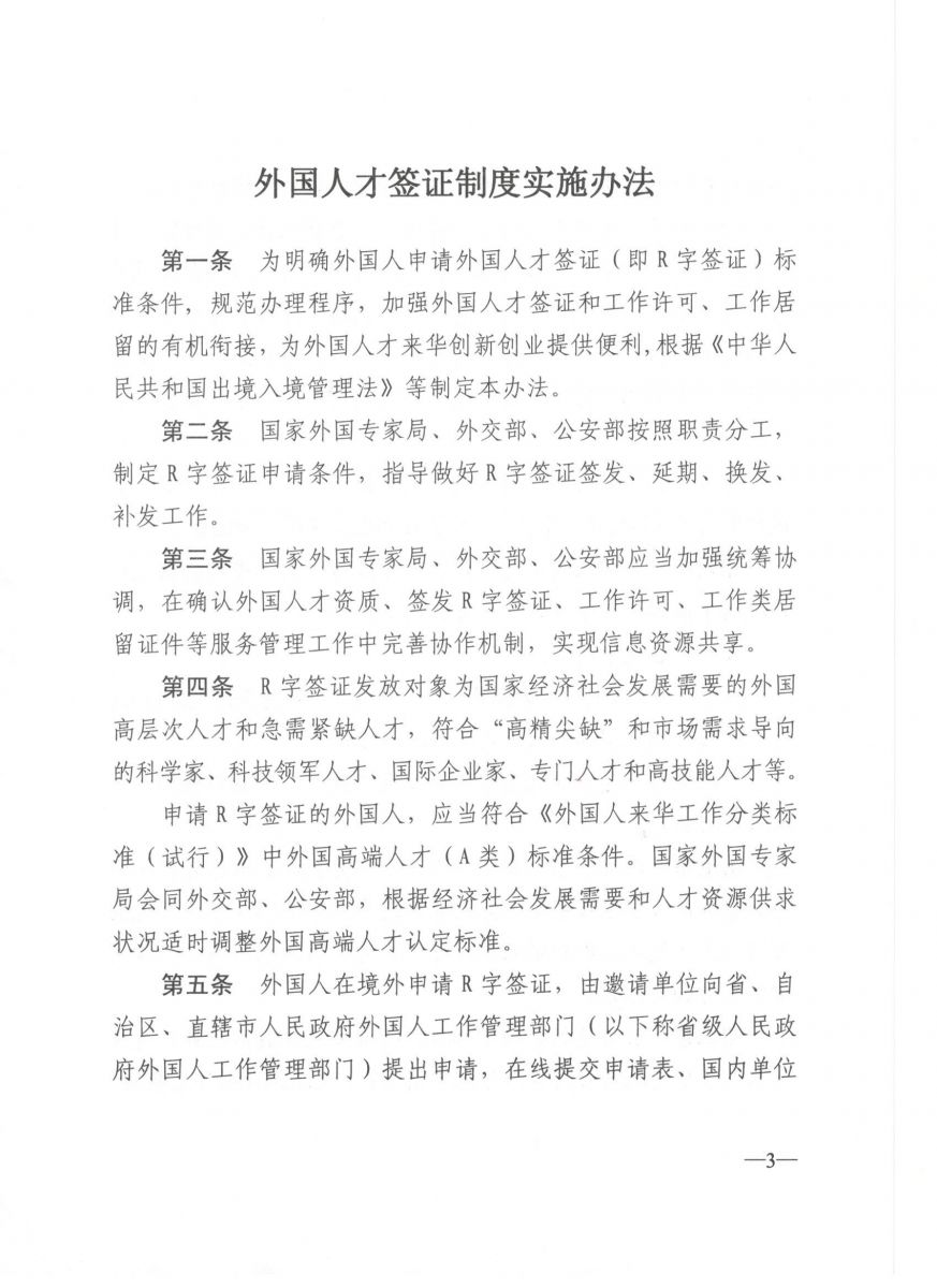 《外国人才签证制度实施办法》
