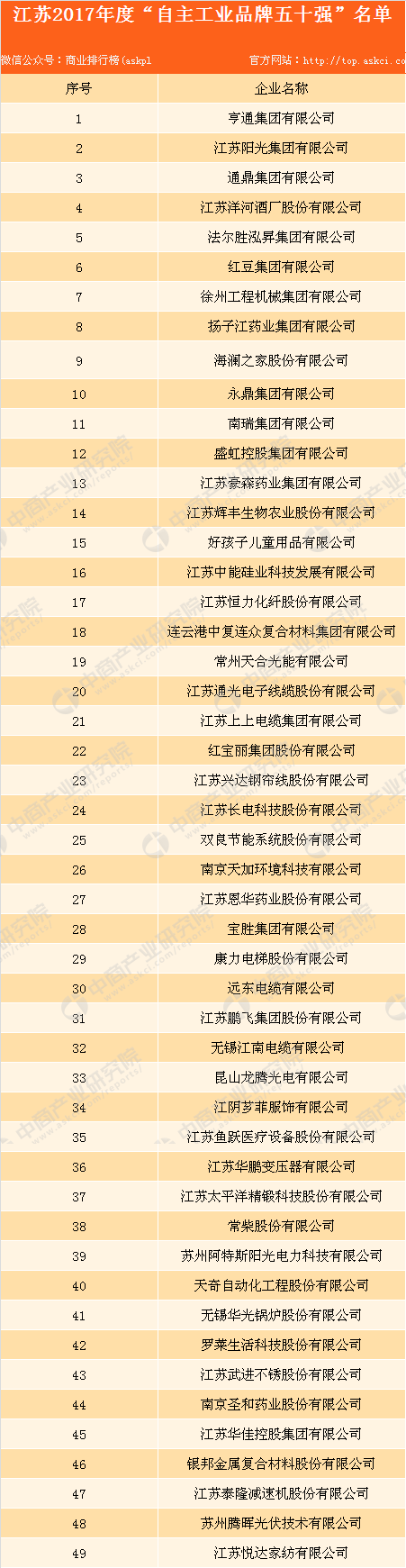 入选2017年度江苏“自主工业品牌五十强”的49家企业名单如下: