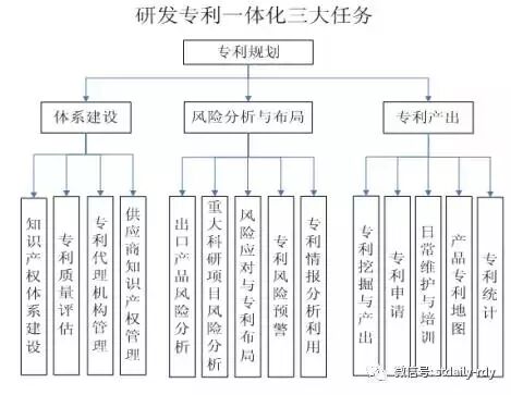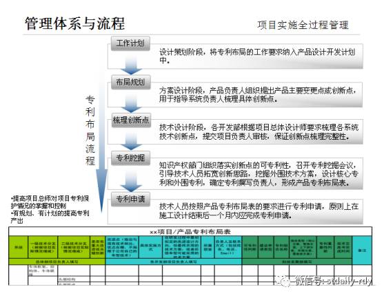 以某公司的专利布局为例: 通过上面两图可以看出,该公司将专利工作作为项目中一项系统化工程,分解到设计策划、方案设计、技术设计、申请等阶段,明确任务和职责,有利于实际操作。当然,在实施方案设计中,不仅要明确流程,还需指明时间节点和相关负责人,确保工作有的放矢。