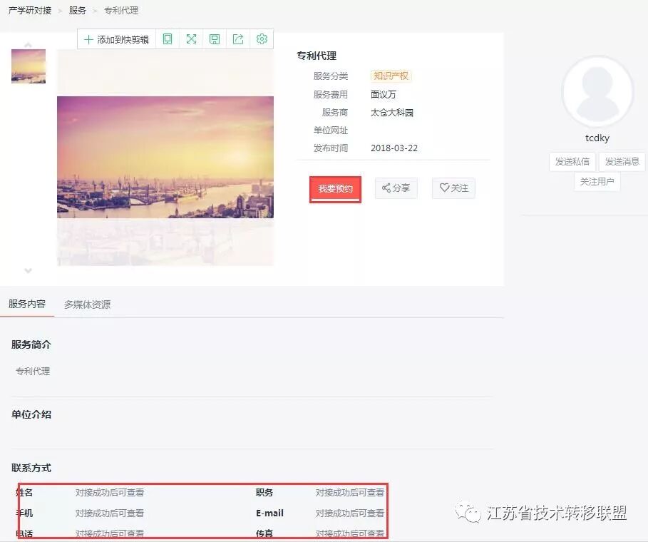 2、在科技服务产品详细界面,点击“我要预约”按钮即可下单预约服务,预约之后就可以在当前页面查看服务机构的联系方式,并进而可以和服务机构直接电话联系洽谈合作事宜。
