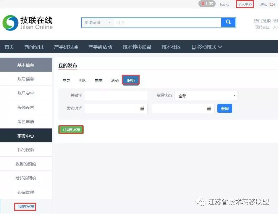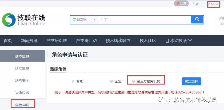 近日,江苏省产学研合作智能服务平台上线了科技服务功能,通过“互联网+”集聚各类品牌科技服务机构,为平台用户提供各类优质科技服务。目前平台用户数已达35000多个,科技服务机构注册申请为平台第三方服务机构后即可在线发布科技服务产品,并和平台35000多个用户开展在线业务对接,具体操作过程简要介绍如下。 一、科技服务机构用户注册 1、通过技联在线网站(www.jilianonline.cn)注册。 2、登录后,点击右上角“个人中心”进入网站后台,再点击“角色申请”按钮后选择第三方服务机构,按要求填写单位基础信息。