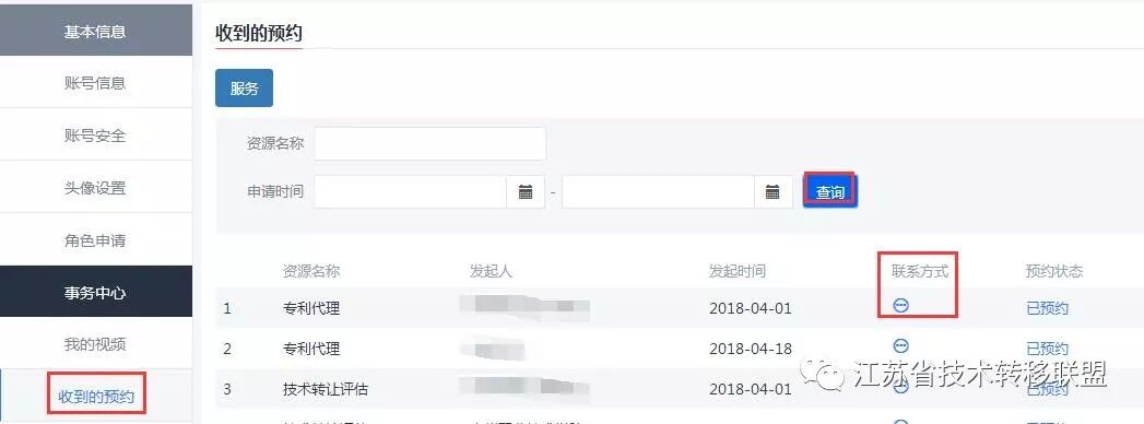 四、查看预约订单 科技服务机构用户从“个人中心”进入后台,在“收到的预约”菜单下点击“查询”按钮即可以看到平台不少用户预约了你的科技服务,点击查看联系方式即可查看服务需求方的联系方式。请记得第一时间和服务需求方及时联系,洽谈具体合作事宜。