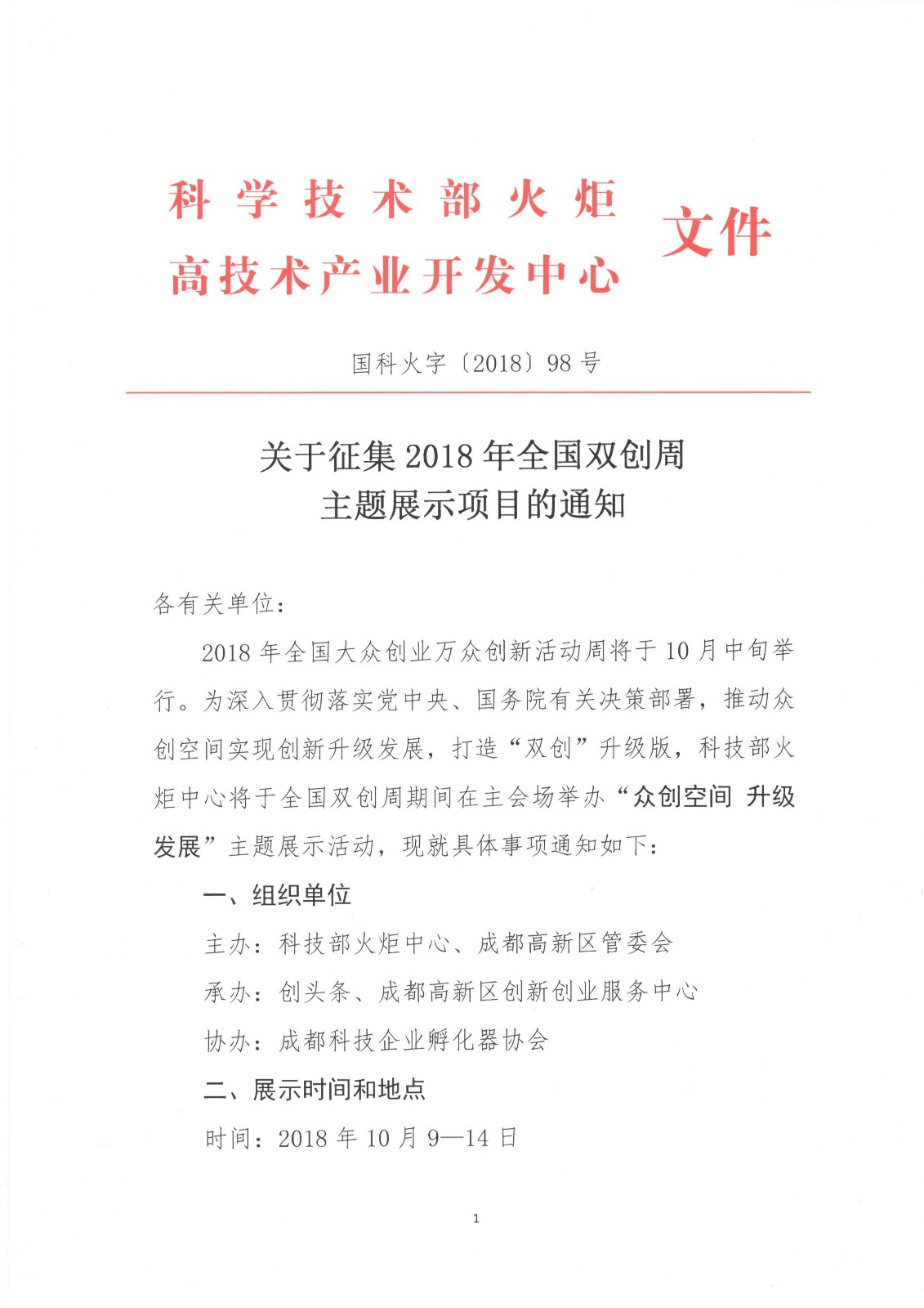 关于征集2018年全国双创周主题展示项目的通知