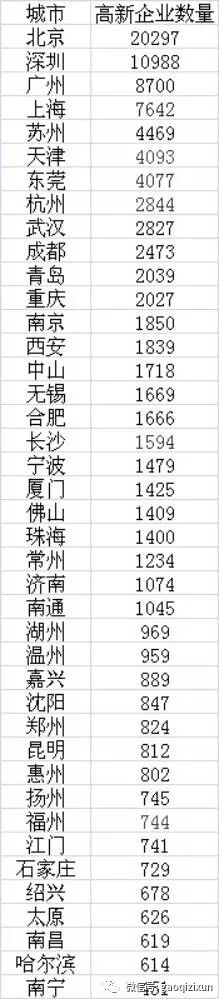 为研究区域创新能力,我们梳理了各城市高新企业数量排行榜。特别引人注意的是,作为第二经济大省和第三经济大省省会的南京、济南两市,都没有进入前12名。 本文选取的区域创新能力单项指标是经过科技部门认定的“(国家级)高新企业数量”(高新技术企业有一系列认定门槛,如自主知识产权情况、研发投入、科技成果转化数量、高新技术产品及服务收入占企业总收入的比重等指标,都在考察范围内)这一指标。“高新企业数量”这个指标虽然不能完整反映一个城市整体的经济质量和水平(有些高新企业一家能顶N家),但是研究和对比高新技术企业数量仍然有意义,因为虽然单个样本可比性差,但整个城市的企业总量则能部分反映一个城市的创新生态,一座城市的高新技术企业多与少、弱与强,决定了未来城市的竞争力。 在这个指标上,截至2017年,北上广深四大一线城市的高新技术产业发展仍然走在最前列,位列第一方阵。第5名开始依次是:苏州、天津、东莞、杭州、武汉、成都、青岛、重庆。他们的高新企业数量都超2000家,是排行榜上的前12强。 表1:高新企业数量超2000家的城市(2017年数据)