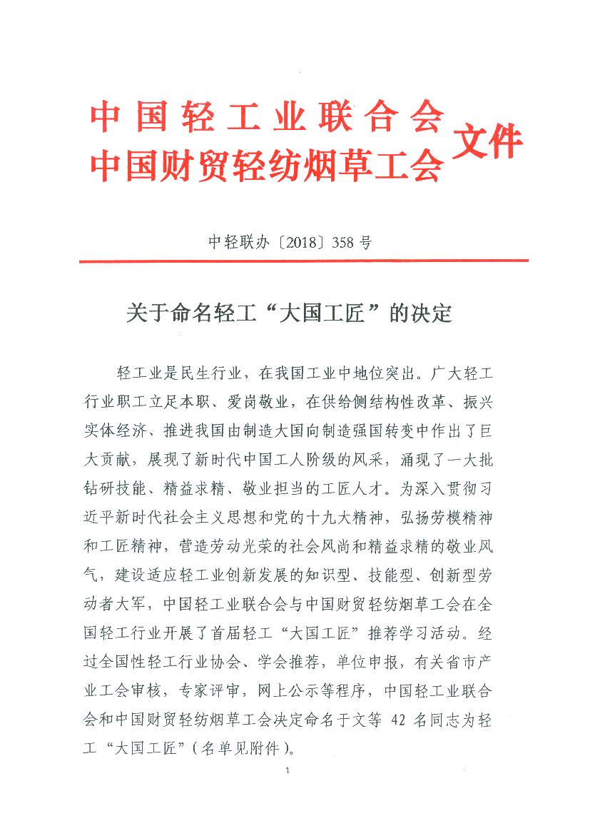 关于命名轻工“大国工匠”的决定
