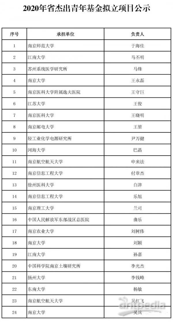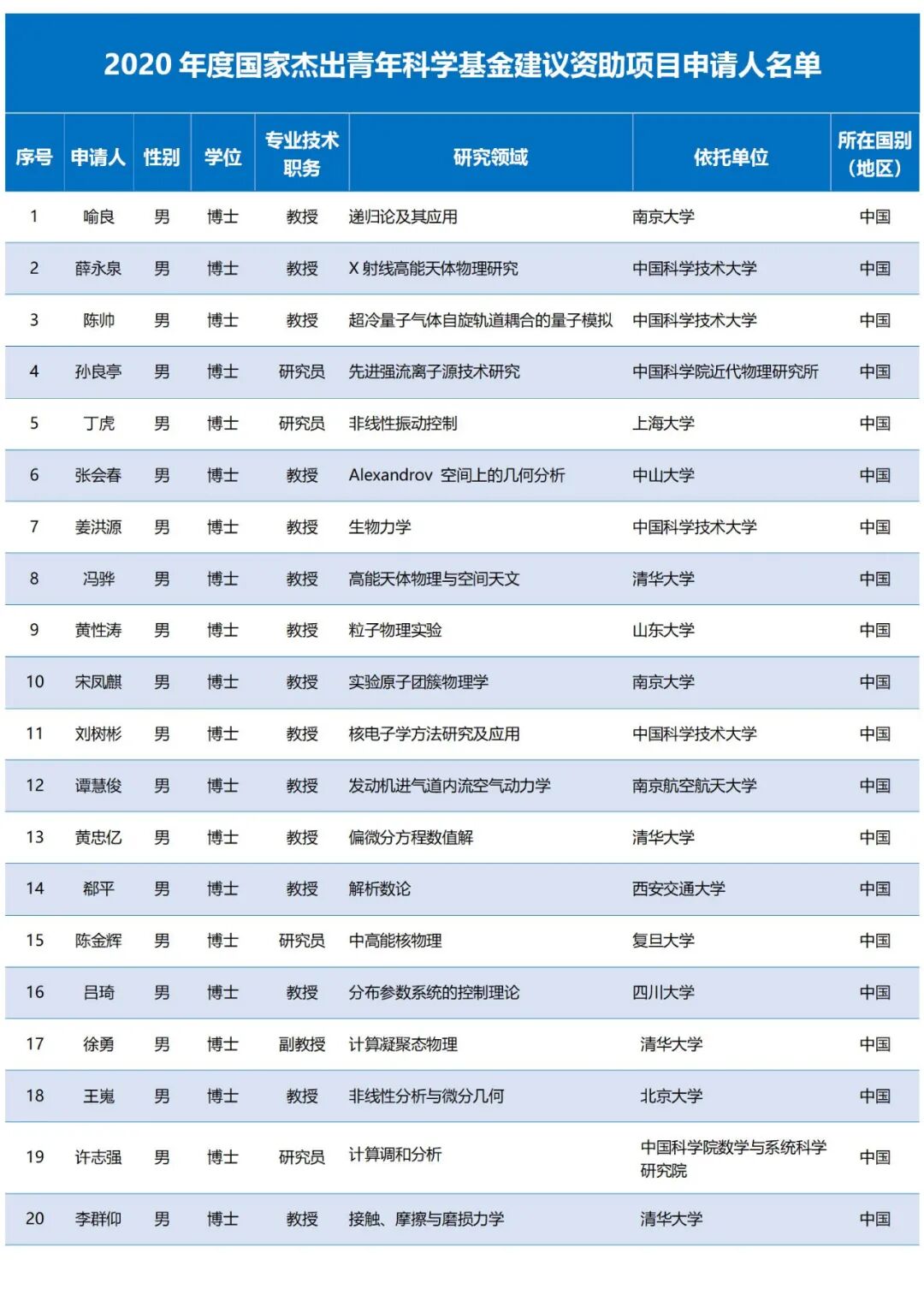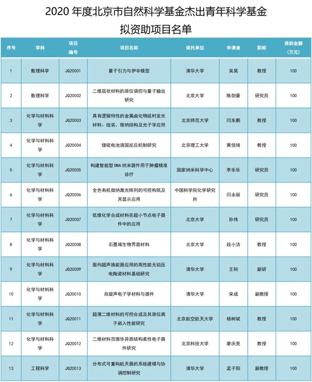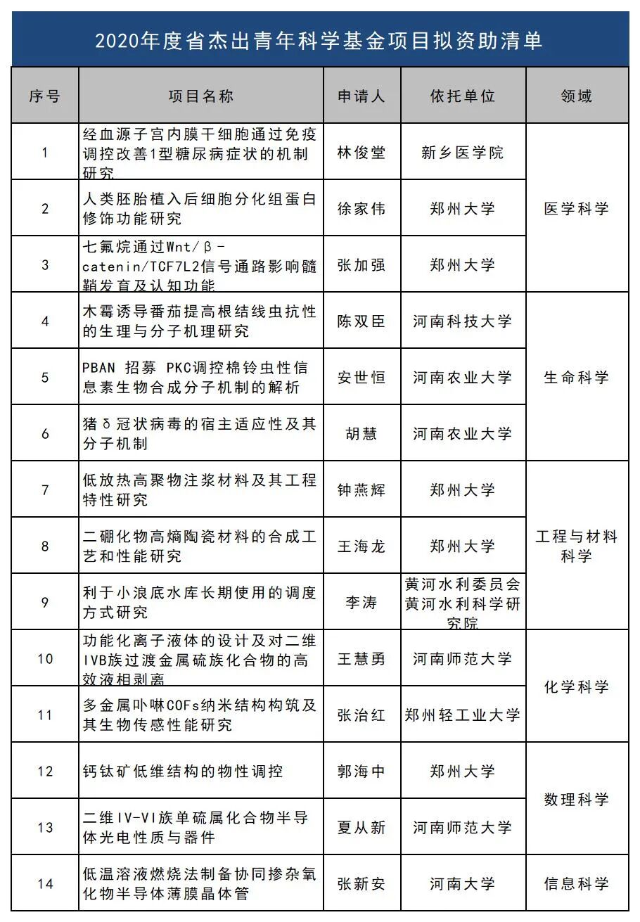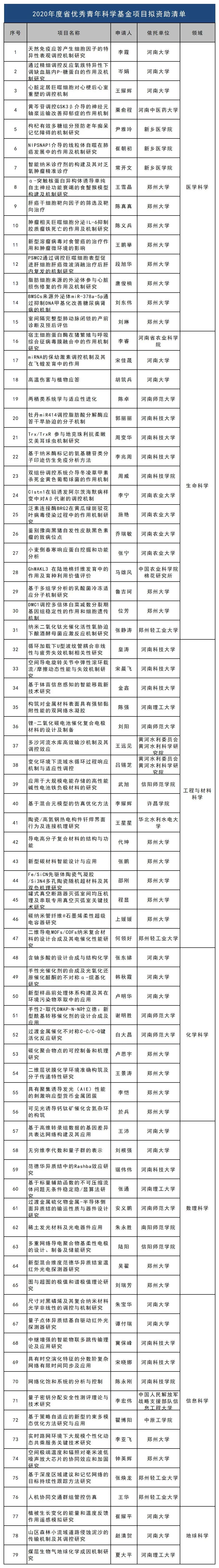 截止目前,国家自然科学基金杰青已经公布拟资助300项名单、国家自然科学基金优青资助625项,部分省份也公布了资助名单,其中,省级杰青已公布428项,省级优青已公布488项人,具体名单如下: 1、国家:杰青300项,优青625项(附部分名单); 2、北京:杰青41项; 3、河南:杰青14项、优青79项; 4、重庆:杰青30项; 5、湖南:杰青59项,优青64项; 6、河北:杰青15项; 7、江苏:杰青50项,优青50项(第一批); 8、黑龙江:杰青20项,优青150项; 9、安徽:杰青40项; 10、辽宁:优青10项; 11、甘肃:杰青19项; 12、浙江:杰青74项; |