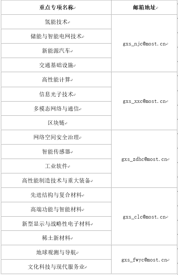 本次征求意见的重点专项包括“氢能技术”、“地球观测与导航”、“稀土新材料”、“储能与智能电网技术”、“新能源汽车”、“交通基础设施”、“高性能计算”、“信息光子技术”、“多模态网络与通信”、“区块链”、“网络空间安全治理”、“智能传感器”、“工业软件”、“高性能制造技术与重大装备”、“先进结构与复合材料”、“高端功能与智能材料”、“新型显示与战略性电子材料”、“文化科技与现代服务业”,重点针对指南方向提出的目标指标和相关内容的合理性、科学性、先进性等方面听取各方意见和建议.