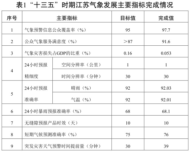 气象工作关系生命安全、生产发展、生活富裕、生态良好。“十四五”时期,做好气象工作意义重大、责任重大。编制《江苏省“十四五”气象发展规划》,在更高水平上推进江苏气象现代化建设,对于充分发挥气象防灾减灾第一道防线作用,更好地服务保障江苏开启全面建设社会主义现代化新征程、奋力谱写“强富美高”新江苏建设现代化篇章具有重要意义。本规划坚持以习近平新时代中国特色社会主义思想为指导,深入贯彻党的十九大和十九届二中、三中、四中、五中全会精神,全面落实习近平总书记关于气象工作的重要指示和对江苏工作的重要指示精神,认真践行“争当表率、争做示范、走在前列”的新使命新要求,按照党中央、国务院的决策部署,根据《中华人民共和国气象法》《江苏省气象灾害防御条例》《全国气象发展“十四五”规划》《江苏省国民经济和社会发展第十四个五年规划和二〇三五年远景目标纲要》《省政府关于推进气象事业高质量发展的意见》等编制,是指导“十四五”时期江苏气象事业发展的行动指引。 一、发展基础和面临形势 (一)“十三五”主要成就。 “十三五”时期,江苏围绕在全国率先基本实现气象现代化奋斗目标,基本建成了结构完善、布局科学、功能先进的气象现代化体系,圆满完成“十三五”气象发展规划确定的主要目标任务,全省气象整体实力显著提升,气象保障经济社会和人民安全福祉取得明显成效,为建设“强富美高”新江苏、高水平全面建成小康社会作出了应有贡献。 1﹒基础业务能力明显提升。 气象综合观测基础不断夯实。观测布局得到优化、自动化程度得到提高。多普勒天气雷达网和风廓线雷达网建成。基本建成苏北龙卷观测试验基地和南京特大城市综合大气垂直廓线观测网。新建颗粒物、反应性气体和温室气体等大气成分观测站45个。智能台站建设全面推进,区域自动气象站社会化保障改革全面实施。省气象灾害监测预警与应急中心建成投入使用,基层气象基础设施达标率从85%提升至88.5%,南京和盐城大丰、苏州东山、连云港西连岛等4个气象站分获首批中国百年气象站和五十年气象站认定。 气象预报精准度持续提高。建立智能网格预报体系,形成从分钟到月的无缝隙精细化预报产品链。提升0-10天预报产品时空分辨率,预报网格距达到2.5公里,0-24小时间隔达到1小时,临近预报、短时预报、中短期预报分别实现10分钟、3小时、6小时滚动更新。强化气象灾害实时监测和临近预警业务,开展龙卷预警试验。建成江苏省天气预报业务一体化系统,实现多级协同监测预警和无缝隙预报制作。强对流天气预警时间提前量达39分钟,预报业务质量稳定在全国前列。 气象信息化能力不断提升。全省68个代表站点云、雾、露等10类天气现象信息实现逐5分钟更新。建成“天镜-江苏”气象综合业务实时监控系统,完成“天擎-江苏”大数据云平台建设。构建智慧化基础设施,整合规范气象数据资源与共享,完善云计算资源池和气象信息基础支撑平台,扩建异地数据灾备中心。通过流程再造、标准制定和系统升级,促进了信息资源更高效利用、系统更可靠运行,气象数据融合应用不断加强。 2﹒防灾减灾成效不断显现。 全省因气象灾害造成的直接经济损失占GDP比率五年下降71%,仅为0.53‰,减损率位于全国各省(区、市)前列。气象灾害防御机制日趋完善,探索融入网格化社会治理体系,气象灾害预警传播“四有”功能配置标准建成率达95%,突发事件预警信息发布体系初步建立,公众气象预报预警覆盖率达97.7%。公共气象服务更加智能高效,全媒体融合更具影响力。专业专项气象服务持续深入,交通、农业气象保险等气象服务取得新成效。公众气象服务满意度从86.1分提升到91.6分。 3﹒服务生态文明取得成效。 生态气象保障服务基础支撑更有力,全省“地空天”立体生态气象观测体系布局进一步完善,初步建立全省大气环境、太湖蓝藻业务平台和全省人工影响天气(以下简称人影)物联网体系。生态气象保障服务产品体系初步形成,产品时效和精细化水平不断提升,大气环境预报时效从1天延长到30天,城市热岛监测精细到10米级。重点领域生态气象保障服务成效更明显,开展重点时段蓝藻水华逐小时监测以及干旱、洪涝对重点湖泊生态(水域面积)影响监测评估等;海上风电气象服务每年保障有效发电量8.8亿千瓦时。 4﹒科技创新区位优势日趋发挥。 开放融合的科技创新机制建设成效显著。省气象局联合在宁气象院校,成立南京大气科学联合研究中心,聚焦精细化预报业务开展关键技术攻关,70%以上的成果进行了业务转化。中国气象局与江苏省政府、南京市政府共建南京气象科技创新研究院。交通气象野外综合观测试验基地进入中国气象局野外观测基地序列。全省气象部门五年获批国家自然科学基金项目14项,国家重点专项3项,省部级项目60项,获省部级科技奖励18项,获专利62项。 关键技术研究取得新的突破。基于风云三号微波成像仪资料同化算法,在中国气象局GRAPES-GFS系统中得到应用。一种约束三维变分同化算法得到国际同行认可,被加入最新官方版本GRAPES-GFSv2.5同化系统。研发了分类强对流识别、人工智能临近外推等关键技术,冰雹客观识别技术在全国应用。升级完善区域中尺度数值模式系统,研发基于多模