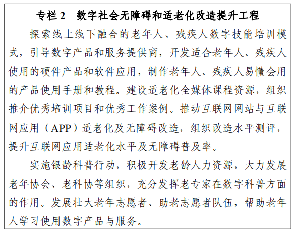 (二)提升高品质数字生活水平 5.培育智慧家庭生活新方式。完善智慧家庭综合标准化体系,提高智能家居系统平台、设备产品、应用的易用性、便捷性和兼容性,增强产品感知与互动能力,便捷用户管理和使用。积极引导企业开展智能家居产品体验、应用培训等活动,提高全民使用智能家居产品的能力。 6.提高智慧社区建设应用水平。优化智慧社区建设规划布局,建立健全社区基础设施和综合服务设施智能化建设与改造群众意见征求机制,提升智能安防、智能停车等设施便捷易用性。运用数字技术完善社区服务需求收集、项目设计、资源链接、过程管理、绩效评价等机制,提高社区服务精准化、精细化水平。建立社区数字技能公益团队和兴趣小组,开展“数字技能进社区”等宣传推广活动。鼓励社区设立数字服务志愿者、引导员,引导社区居民用好数字产品和服务。 7.丰富新型数字生活场景。推动5G、超高清视频、虚拟现实、人工智能等数字技术在生活中普及应用,提高电子商务、移动支付、共享经济、智慧出行等新型数字生活服务体验,发展智慧商店、智慧商圈,提升居民数字资源、数字工具的使用意愿,共同营造良好的数字生活氛围,让全民享受便捷的数字服务。 8.开展数字助老助残行动。充分考虑老年人和残疾人群体特殊性,加强数字设备、数字服务信息交流无障碍建设,在老年人、残疾人的出行、就医、就餐、购物等高频服务场景中保留人工服务渠道,防止出现强制性数字应用、诱导性线上付款等违规行为。依托老年大学、开放大学、养老服务机构、残疾人服务机构、社区教育机构、老科协等,丰富体验学习、尝试应用、经验交流、互助帮扶等老年人、残疾人数字技能培训形式和内容。推动形成社会各界积极帮助老年人、残疾人融入数字生活的良好氛围,构建全龄友好包容社会。