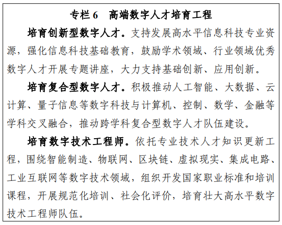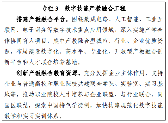 (三)提升高效率数字工作能力 9.提高产业工人数字技能。完善企业员工职业技能培训体系,建立和共享职工培训中心、网络学习平台等培训载体,丰富数字素养与技能培训内容,提高员工职业胜任力。健全企业职工培训制度,针对产业工人系统开展面向生产全环节的数字技能培训,持续壮大现代产业工人队伍,培养数字领域高水平大国工匠,提升数字化生产能力。提升企业管理人员数字素养,建立数字化思维,提高数字化经营管理能力。