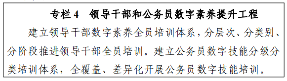 10.提升农民数字技能。构建现代农业科教信息服务体系,优化完善全国农业科教云平台,汇集整合新技术推广、电商销售、新媒体应用等优质培训资源,持续推进农民手机应用技能培训工作,提高农民对数字化“新农具”的使用能力。引导企业、公益组织等参与农民数字技能提升工作,推动数字服务和培训向农村地区延伸。 11.提升新兴职业群体数字技能。面向“互联网+教育”、互联网医疗、电子商务、供应链管理服务、线上办公、“虚拟”产业园、“无人经济”等新业态新模式,制定数字领域新职业的职业标准,丰富职业培训课程,开展从业人员培训,壮大新兴职业群体人才队伍。引导支持新兴职业群体,积极利用5G、人工智能、虚拟现实、大数据、区块链等数字技术创新创业。 12.开展妇女数字素养教育与技能培训。依托各类网络平台,推出一批面向妇女设计制作的数字素养公开课,增强妇女安全上网、科学用网、网上创业等的数字意识和能力。加强妇女通过网络参与经济生活的能力,加大直播带货、电商运营等培训力度,引导西部地区、偏远山区妇女网上就业创业。 13.提升领导干部和公务员数字治理能力。加大领导干部和公务员信息化培训力度,丰富数字经济、数字社会、数字政府等领域线上培训资源,把提高党员领导干部数字治理能力作为各级党校(行政学院)的重要教学培训内容。引导领导干部和公务员运用网络了解民意、开展工作,提升学网、懂网、用网的能力。在公务员选拔任用中,加强数字能力方面的考察。