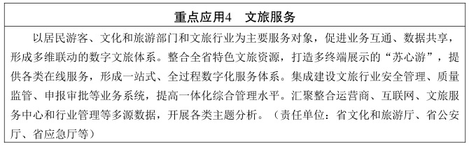 按照“1234+”总体架构,全面打造“数字化、智能化、一体化”数字政府。具体为: “1”——一个统一入口。按照统一规划、统一标准、统一建设、统一管理原则,构建数字政府统一入口,打造“苏服办”(“苏服码”)品牌。 “2”——两大主干应用平台。着力完善一体化政务服务平台、一体化在线监管平台,集成数字政务三大领域主体应用,形成数字政府两大主干应用平台全覆盖。 “3”——三大运行体系。聚焦数字政务、数字社会、数字生态三大运行体系,加强重点工程、重点应用建设,全面推进数字化转型和治理体系变革。 “4”——四大基础支撑平台。依托一体化大数据中心,统一建设智能感知、云网环境、数据共享、应用技术四大基础支撑平台,加快数字政府一体化建设基础和能力升级。 “+”——若干应用服务。适应经济社会发展需要和人民群众对美好生活的新期盼新需求,不断拓展应用场景和丰富服务内容,努力提升政府效能和人民群众获得感满意度。 (五)业务和数据融合架构。