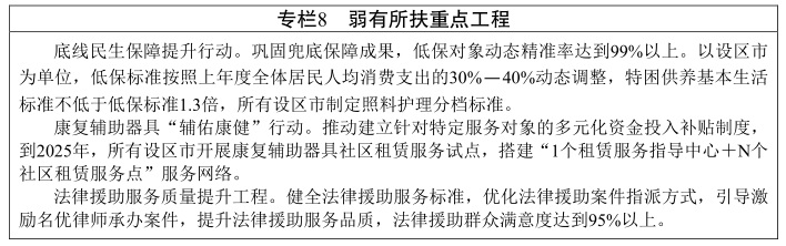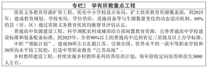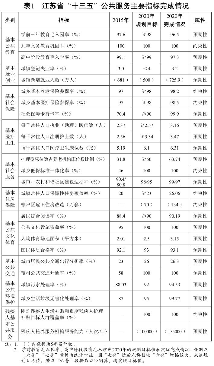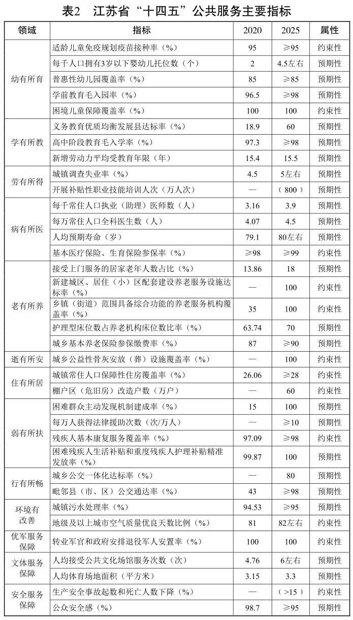 公共服务是政府为满足城乡居民生存和发展需要,运用法定权利和公共资源,面向全体居民或特定群体,组织协调或直接提供的产品和服务。从服务供给的权责分类来看,公共服务包括基本公共服务、普惠性非基本公共服务两大类。其中,基本公共服务是保障全体居民生存和发展基本需要、与经济社会发展水平相适应的公共服务,政府承担主要保障供给数量和质量的责任,引导市场主体和公益性社会机构补充供给。普惠性非基本公共服务是为满足居民更高层次需求、保障社会整体福利水平所必需但市场自发供给不足的公共服务,政府通过支持公益性社会机构或市场主体,增加服务供给、提升服务质量,推动重点领域非基本公共服务普惠化发展,实现大多数居民以可承受价格付费享有。此外,为了满足居民多样化、个性化、高品质服务需求,一些完全由市场供给、居民付费享有的生活服务,可以作为公共服务体系的有益补充,政府主要负责营造公平竞争的市场环境,引导相关行业规范可持续发展,做好生活服务与公共服务衔接配合。随着经济社会发展水平的不断提升,基本公共服务、非基本公共服务、生活服务三者之间的边界将随之发生变化,公共服务体系的范围、水平和质量将稳步有序提升,不断满足人民群众日益增长的美好生活需要。 “十四五”时期,是江苏全面落实习近平新时代中国特色社会主义思想特别是习近平总书记对江苏工作重要指示精神、深入践行“争当表率、争做示范、走在前列”新使命新要求的重要时期,是开启全面建设社会主义现代化新征程、奋力谱写“强富美高”现代化新篇章的关键时期。持续推进基本公共服务均等化,扩大普惠性非基本公共服务供给,丰富多层次多样化生活服务供给,构建优质均衡的公共服务体系,是落实以人民为中心的发展思想、创造高品质生活的重大举措,是促进社会公平正义、扎实推进共同富裕的重要任务,是促进形成强大国内市场、构建新发展格局的重要支撑,对增强人民群众获得感、幸福感、安全感,促进人的全面发展和社会全面进步,具有十分重要的意义。 本规划依据《“十四五”公共服务规划》《江苏省国民经济和社会发展第十四个五年规划和二○三五年远景目标纲要》编制,主要阐明“十四五”时期全省公共服务的发展思路、主要目标、重点任务,是当前和未来一段时期推动公共服务高质量发展的综合性、基础性、指导性文件。根据国家、省相关文件和“十三五”时期我省工作基础,本规划将“十四五”时期公共服务主要范围确定为幼有所育、学有所教、劳有所得、病有所医、老有所养、逝有所安、住有所居、弱有所扶、行有所畅、环境有改善、优军服务保障、文体服务保障、公共安全保障等13个领域。 一、规划背景 (一)发展基础。 “十三五”时期,全省深入践行以人民为中心的发展思想,按照坚守底线、突出重点、完善制度、引导预期的要求,持续排查解决突出民生问题,以保基本、均等化、普惠化为方向,加强公共服务体系建设,城乡、区域、群体间基本公共服务均等化水平持续提升,人民群众的获得感幸福感安全感进一步增强,为高水平全面建成小康社会提供了有力保障。 制度体系更加健全。印发《“十三五”基本公共服务均等化规划》《“十三五”时期基本公共服务清单》《“十三五”时期基层基本公共服务功能配置标准(试行)》《关于建立健全基本公共服务标准体系的实施意见》等政策文件。建立基本公共服务体系建设监测统计和群众满意度调查制度,定期发布基本公共服务水平指数和发展指数,群众满意度从2016年的74.6分提高到2020年的86.05分。优化调整财政支出结构,强化省与市县事权和支出责任,印发《基本公共服务领域省与市县共同财政事权和支出责任划分改革方案》及医疗卫生、教育、交通运输、公共文化等9个领域具体改革方案。 保障能力全面提升。87项基本公共服务清单项目和保障标准得到有效落实,基层基本公共服务标准化配置实现度达到90%以上,民生支出占一般公共预算比重提高到79%。普惠性幼儿园覆盖率达到85%,90%以上的义务教育学校达到省定办学标准,15年免费特殊教育全面实施,新增劳动力平均受教育年限超过15年。城镇登记失业率控制在3%左右,城镇零就业家庭动态为零。每千常住人口医疗卫生机构床位数6.31张、每千常住人口执业(助理)医师3.16人,城乡居民基本公共卫生服务人均最低补助标准提高到80元,人均预期寿命超过79岁,居民主要健康指标接近或达到高收入国家发展水平。各类社会保险参保率保持在98%左右,基本形成以居家为基础、社区为依托、机构为补充、医养相结合的养老服务体系,每千名户籍老年人拥有床位40张。全面建立老年人福利补贴制度,城乡独居留守老年人关爱巡访制度覆盖全省。全面建成覆盖全员的五级退役军人服务保障体系。残疾人康复设施覆盖率达到76.9%,居全国首位。空气质量优良天数比例为81%,主要污染物减排完成国家下达任务。 均等化水平持续提高。基本公共服务资源持续向基层、农村和困难群众倾斜,苏南、苏北、苏中地区及市域内基本公共服务差距总体缩小。以居住证为载体的基本公共服务制度体系全面建立,农业转移人口等非户籍人口基本公共服务均等化水平明显提升。义务教育基本均衡发展县比例达到