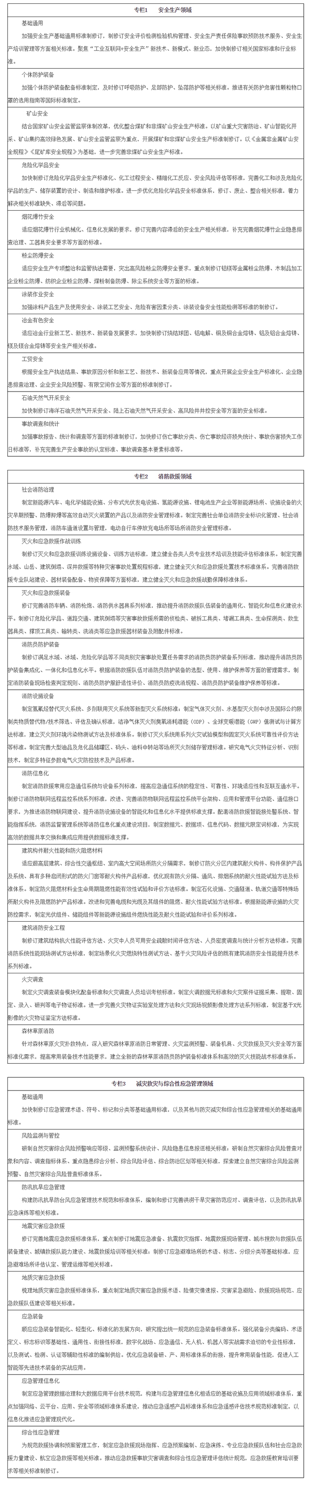 (二)加快推进急需短缺和重要标准制修订。循序渐进务求实效,按照“先急后缓”原则加强统筹,集中力量加快修订与人民生命安全关系最直接的标准,争取早日出台、确保有效管用。密切跟踪研究事故灾害暴露的标准化短板问题,对标落实法律法规和应急管理标准体系建设要求,加快重点行业和关键领域标准立改废。在安全生产方面,加强基础通用标准,个体防护装备标准,事故调查统计相关标准,矿山安全、危险化学品安全、烟花爆竹安全生产、石油天然气开采安全标准,以及粉尘防爆、涂装作业、冶金有色、工贸安全等领域重要标准制修订;在消防救援方面,加快制修订消防救援队伍队站建设、装备建设、作战训练,消防通信指挥信息化、消防物联网建设、消防监督检查、消防产品监督管理、社会消防治理、社会消防技术服务管理、火灾调查等相关标准;在减灾救灾与综合性应急管理方面,加快制修订应急管理术语、符号、标记和分类等基础通用标准,风险监测和管控标准,水旱灾害应急管理标准,地震灾害应急救援相关标准,地质灾害应急救援相关标准,应急装备标准,应急管理信息化标准,救灾和物资保障标准,应急预案制定和演练、救援现场指挥、专业应急救援力量建设标准,应急救援事故灾害调查和综合性应急管理评估统计规范标准,应急救援教育培训标准,以及其他防灾减灾救灾和综合性应急管理有关标准。 重点领域标准制修订