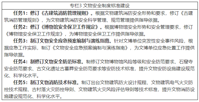 (三)完善文物安全制度标准。 健全文物安全法规制度。依据文物保护法和相关法规,出台文物安全规章和规范性文件,完善文物安全监管与执法督察制度建设,明确文物安全责任和管理措施要求,构建以文物保护法为核心的文物安全法规制度体系,努力实现安全管理法治化。 健全文物安全管理制度。针对文博单位安全管理特点,制订完善文物安全风险评估与控制、安全责任落实、安全巡查检查、安全隐患整改整治、安全防护工程实施与管理、应急预案与演练等安全管理制度,实现文物安全管理制度化、精准化。 健全文物安全技术标准。针对文博单位安全防护需求,制订完善文物安防、消防和防雷技术标准。根据古文化遗址、古墓葬、石窟寺安防和古建筑、传统村落消防等安全防范需求,制订专项技术标准。出台文物安全监管平台建设技术指导标准,实现文物安全防护智能化和标准化。