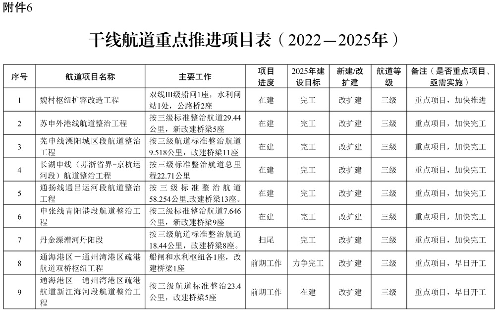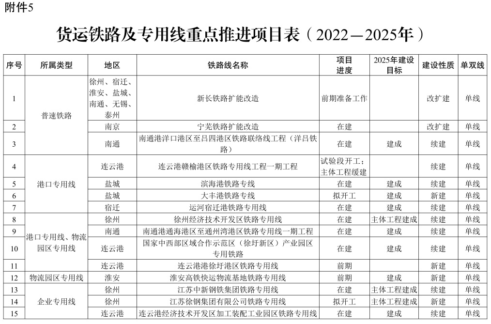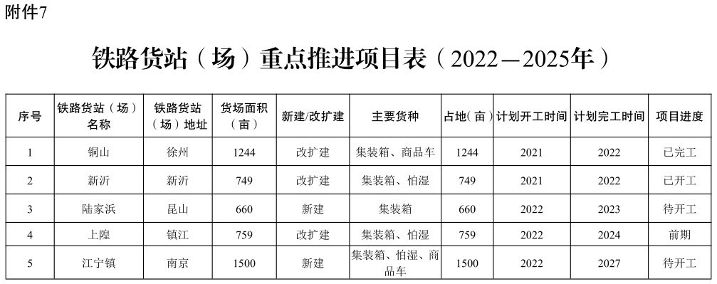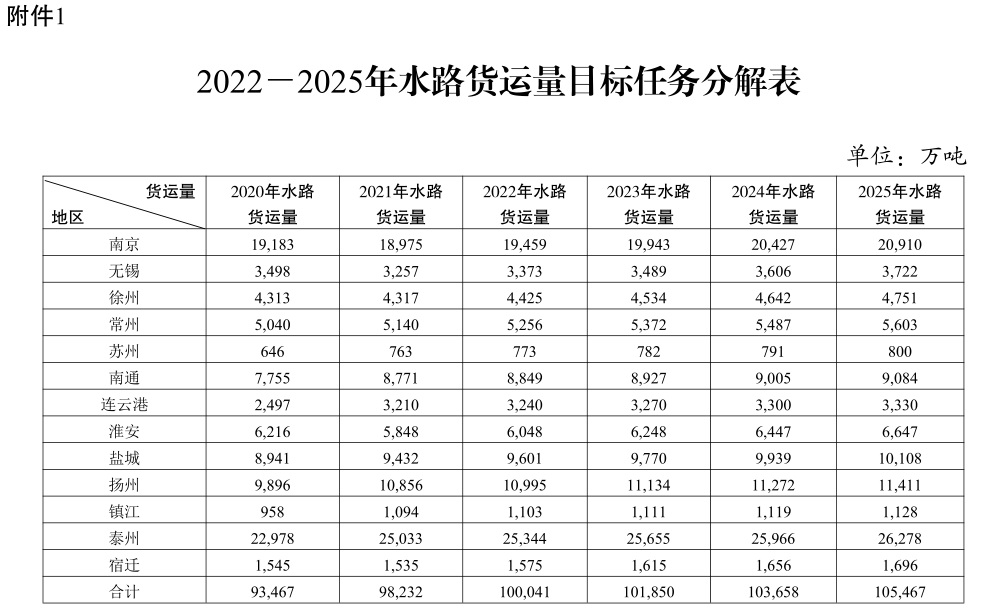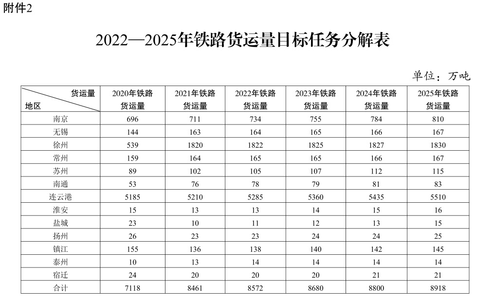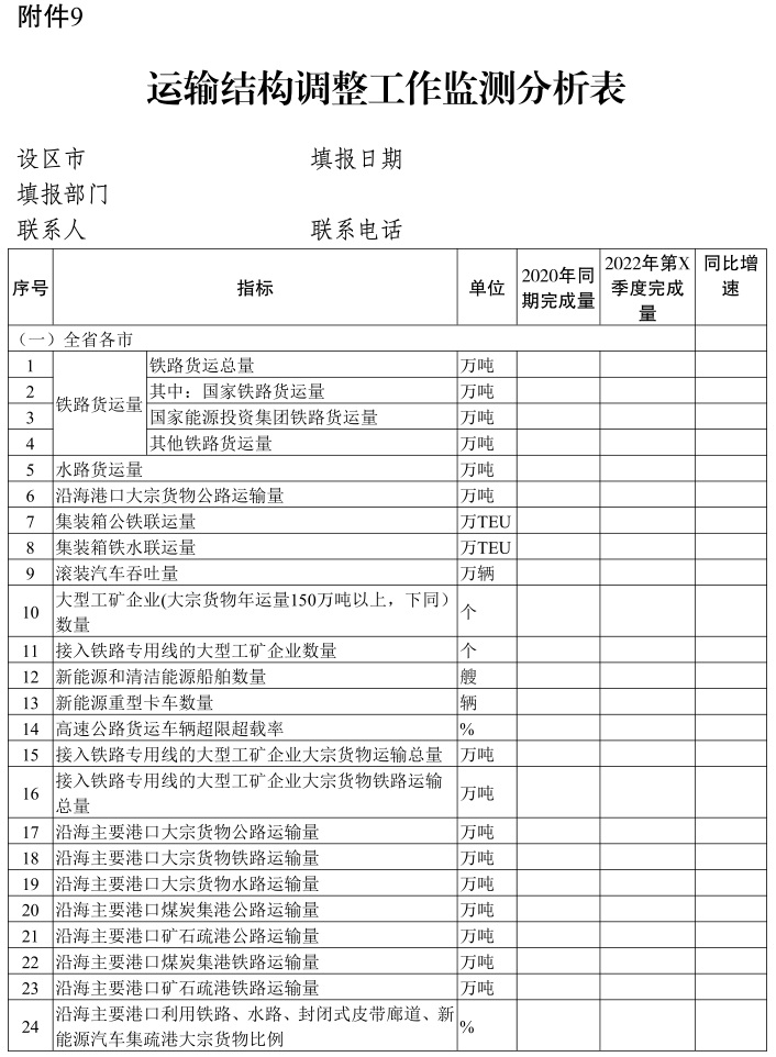 附件:1.2022-2025年水路货运量目标任务分解表 2.2022-2025年铁路货运量目标任务分解表 3.2022-2025年内河(长江除外)集装箱运量目标任务分解表 4.推进多式联运发展优化调整运输结构重点工作任务表 5.货运铁路及专用线重点推进项目表(2022-2025年) 6.干线航道重点推进项目表(2022-2025年) 7.铁路货站(场)重点推进项目表(2022-2025年) 8.多式联运枢纽(基于铁路和空港)重点推进项目表(2022-2025年) 9.运输结构调整工作监测分析表