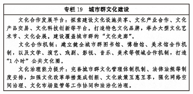 (四)创新融合发展体制机制 健全中央和地方旅游发展工作体制机制,完善文化和旅游融合发展体制机制,强化文化和旅游部门的行业管理职责。创新风景名胜区管理体制,探索建立景区文化评价制度。理顺饭店、民宿等旅游住宿业管理体制。 十一、促进城乡区域文化协调发展 优化城乡和区域文化资源配置,推进一体化谋划、联动式合作、协同性发展,加快形成点线面结合、东中西呼应、城乡均衡协调的文化发展空间格局,促进文化更平衡更充分发展。 (一)推动区域文化协调发展 加强区域文化协同创新,健全合作互助、扶持补偿机制,推动东部地区以创新引领文化发展,加大力度支持中西部地区以及东北等老工业基地文化发展,扶持革命老区、民族地区、边疆地区文化发展,形成相互促进、优势互补、融合互动的区域文化发展格局。围绕京津冀协同发展、长江经济带发展、粤港澳大湾区建设、长三角一体化发展、黄河流域生态保护和高质量发展等区域重大战略,健全推进区域内文化协同发展机制,提升公共文化设施互联互通水平,加强区域文化产业带建设,实现区域文化建设水平整体提高。促进形成文化产业发展新格局,创新城市群文化一体化发展体制机制,共建高水平合作平台,加强公共文化服务便利共享。完善以城带乡、城乡融合的文化发展体制机制,发挥城市带动辐射作用,加快城乡间文化要素双向流动,形成以点带面、特色鲜明、优势互补、均衡配置的城乡文化发展新格局。