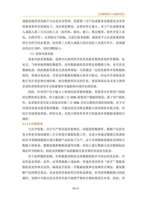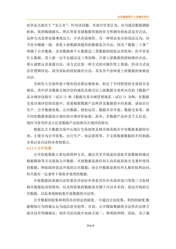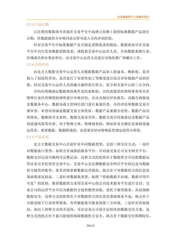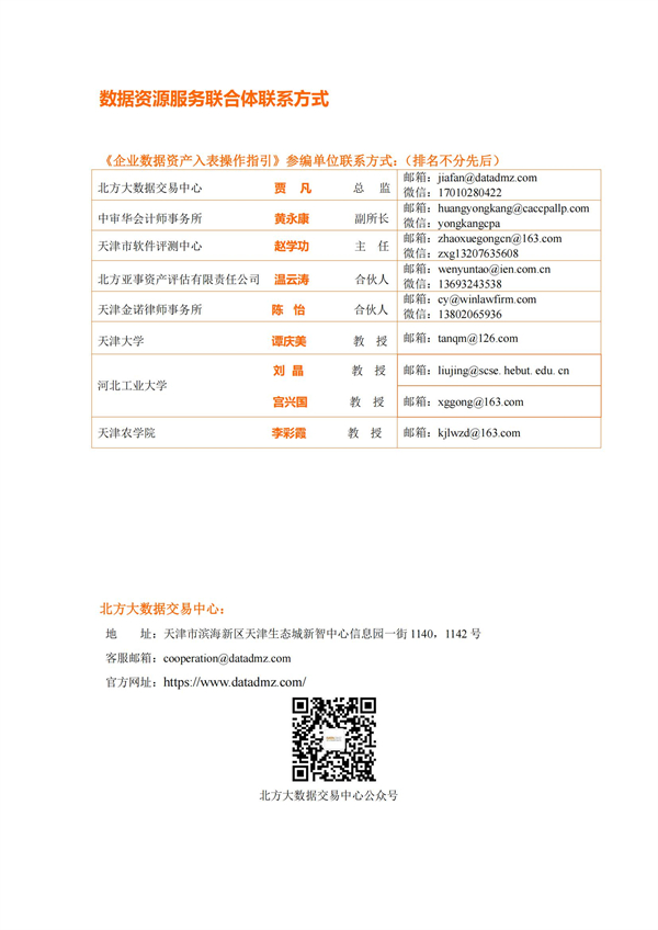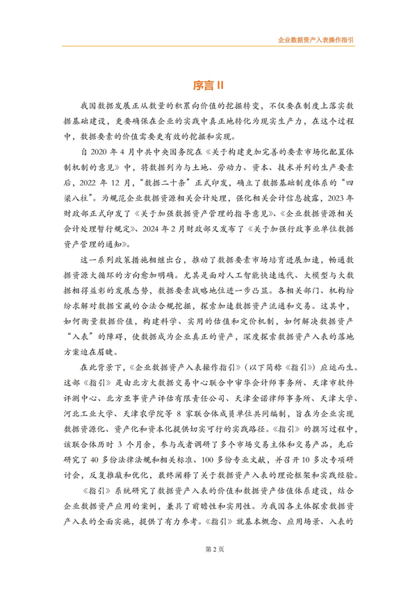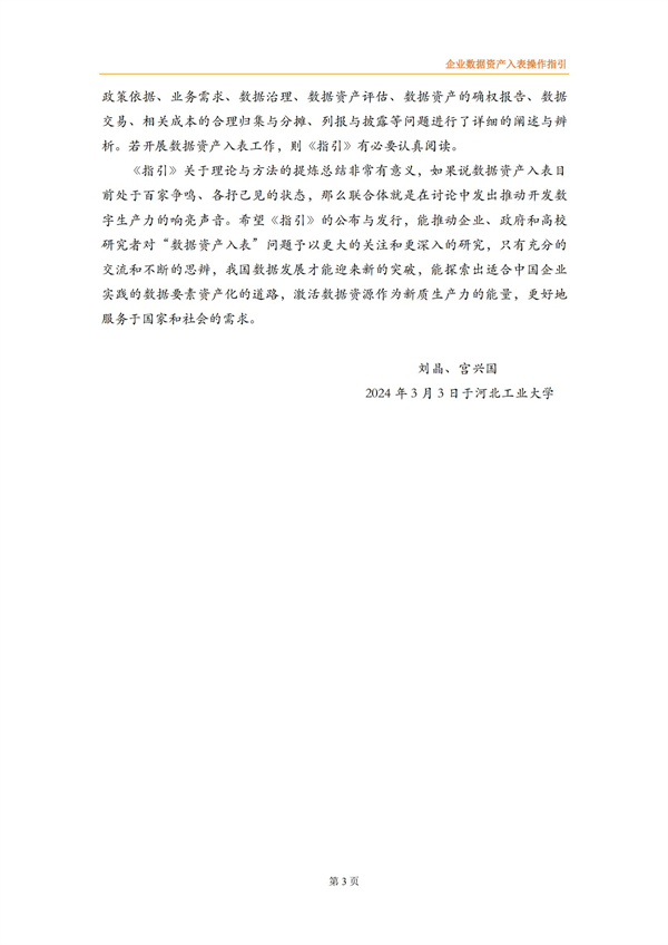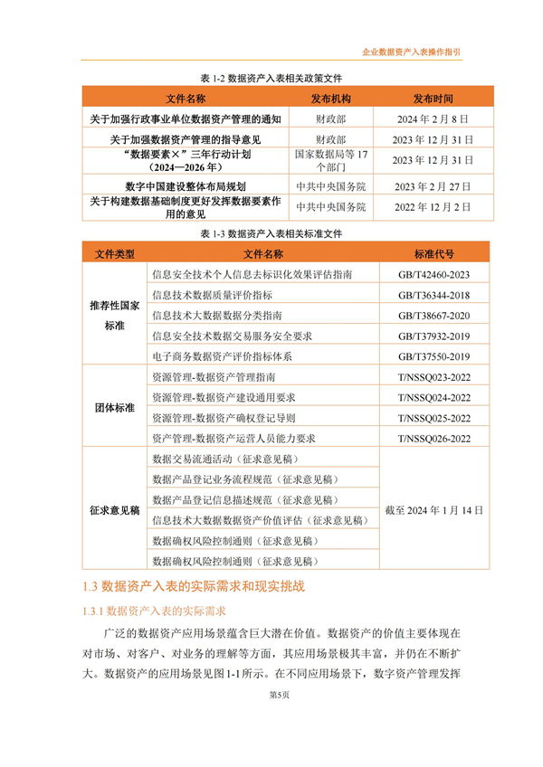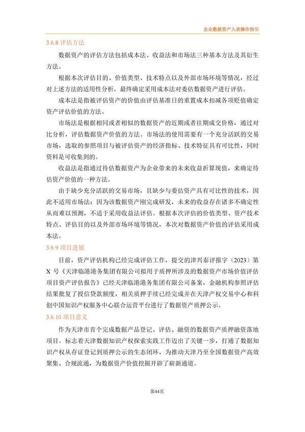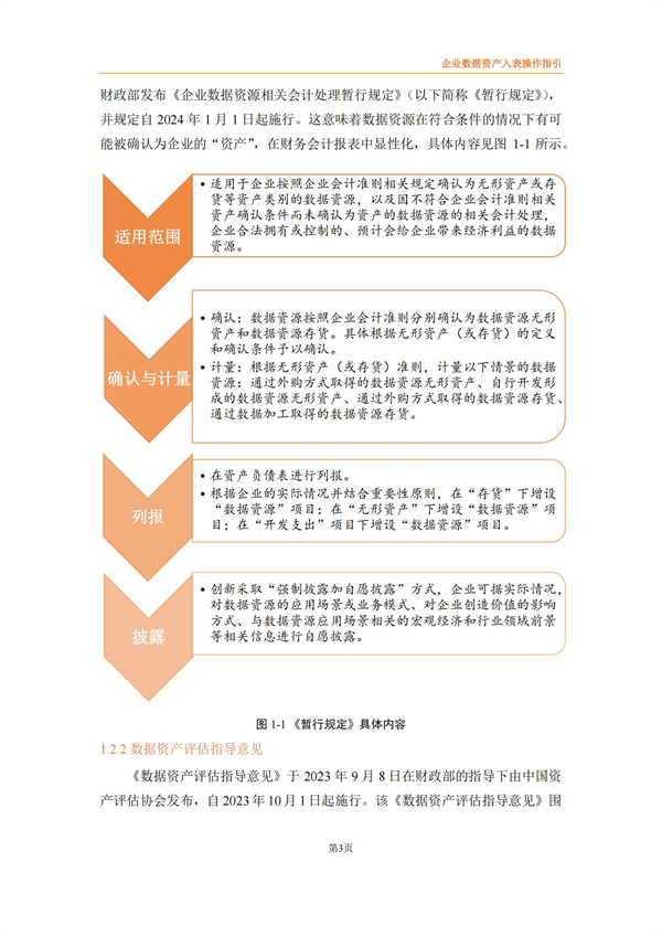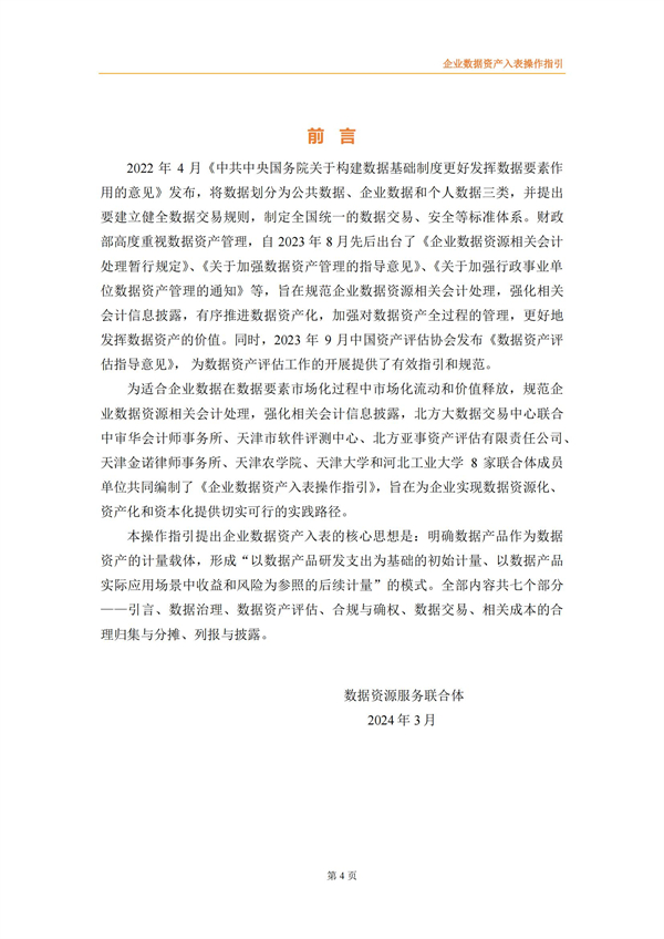 企业数据资产入表操作指引来源:数据资源服务联合体 时间:2024-03-15 14:24:03 作者: 2022年4月《中共中央国务院关于构建数据基础制度更好发挥数据要素作用的意见》发布,将数据划分为公共数据、企业数据和个人数据三类,并提出要建立健全数据交易规则,制定全国统一的数据交易、安全等标准体系。 财政部高度重视数据资产管理,自2023年8月先后出台了《企业数据资源相关会计处理暂行规定》、《关于加强数据资产管理的指导意见》、《关于加强行政事业单位数据资产管理的通知》等,旨在规范企业数据资源相关会计处理,强化相关会计信息披露,有序推进数据资产化,加强对数据资产全过程的管理,更好地发挥数据资产的价值。同时,2023年9月中国资产评估协会发布《数据资产评估指导意见》,为数据资产评估工作的开展提供了有效指引和规范。 为适合企业数据在数据要素市场化过程中市场化流动和价值释放,规范企业数据资源相关会计处理,强化相关会计信息披露,北方大数据交易中心联合中审华会计师事务所、天津市软件评测中心、北方亚事资产评估有限责任公司、天津金诺律师事务所、天津农学院、天津大学和河北工业大学8家联合体成员单位共同编制了《企业数据资产入表操作指引》,旨在为企业实现数据资源化、资产化和资本化提供切实可行的实践路径。 《指引》提出企业数据资产入表的核心思想是:明确数据产品作为数据资产的计量载体,形成“以数据产品研发支出为基础的初始计量、以数据产品实际应用场景中收益和风险为参照的后续计量”的模式。 《指引》详细阐述了数据资产相关概念及应用场景、政策依据及业务需求、基本原则、参与主体、基本路径、数据治理、数据资产评估、合规与确权、数据交易、成本归集与分摊、列报与信息披露等数据资产入表相关内容。《指引》能够为企业实现数据资源化、资产化和资本化提供切实可行的实践路径,改善企业财务报表结构,提高企业估值及核心竞争力,为投资者提供更多选择与回报。 具体内容如下: